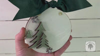 5" x 4.5" Round white disc ornament with layered wood trees and snowflakes, hung by wire and topped with a beautiful dark green ribbon.