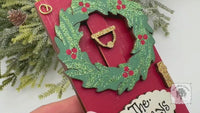 2.75" x 6.25" Our dimensional wood red front door ornament features a beautifully glittered, handpainted  traditional Christmas wreath, a gold door knob & knocker, and a cute oval tag for personalizing. You can have us add the name, year, or address number on the oval.  This is a great option for a new or 1st home, a realtor gift, or simply a festive holiday ornament for anyone on your list!