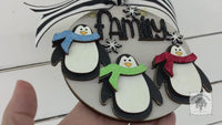 Handmade wood Christmas ornament featuring 3 Penguins and a raised wood "family" word; personalized as requested. A super cute Penguin ornament for a family of three, 3 children or 3 grandkids!