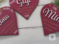 Red handpainted wood heart "Gigi" ornament with raised white glittered "Gigi" word and fun engraved saying "like a grandma but so much cooler!"