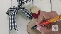 Our Goldendoodle dog ornament in gold is hanging from a cute checked ribbon and adorned with a red glittered bow. This silhouette style dog ornament is super cute to personalize to add your Doodle to the Christmas tree or as a cute Kennel cage name sign.