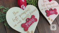 Cherish the memories of your beloved pup with our handmade wood dog memorial ornament. Crafted with care, each ornament is personalized with your pet's name and adorned with an intricate paw print design, symbolizing the love and joy they brought to your life. Hang it on your tree or give it as a heartfelt gift to someone who has experienced the loss of a dog. This sentimental keepsake will serve as a beautiful reminder of the cherished moments shared with your loyal companion.