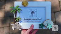A fun way to showcase your coastal vacation or to add to your beach house decor. This dimensional beachy photo frame includes a sea shell, sea turtle, 2 different sized palm trees, 1 small flower, small sun & 2 starfish. The year can be added to large white shell as shown in pictures. If you choose “Frame WITH year” indicate year in personalization box.