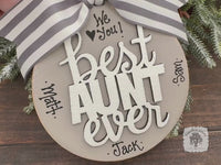 5” x 4.5” Aunt ornament with raised glittered wood "Best Aunt Ever" words and topped with a fun ribbon! Add the Aunt's name and year, or opt for the popular option of adding the nieces and nephews names around the rim of the ornament.
