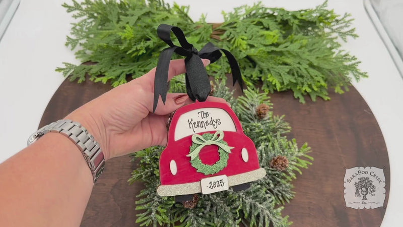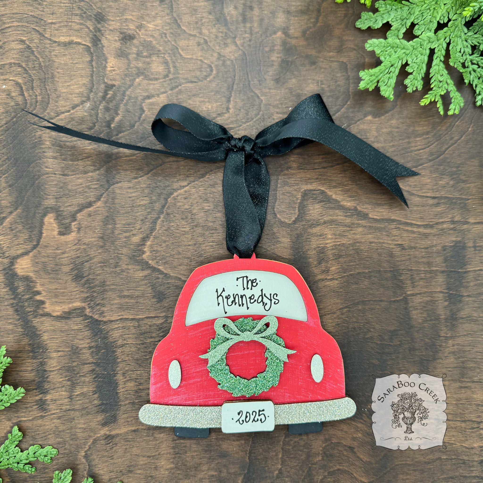 Christmas Car Ornament w/ Holiday Wreath - Personalized Christmas 2025 Ornament