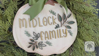 This charming 14" x 11" handmade wood pumpkin sign is perfect for fall decorating.  It's warm autumn design makes it a beautiful addition to your front door, entryway, or mantel.  This custom piece features your family name beautifully displayed in raised brushed gold lettering, accented with all the green and gold leafy details shown here and topped with a satin green bow.  A wire hanger on the back makes for easy hanging.  Please indicate the family name in the "Personalization/Customization Request" box.