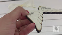 4 3/8” x 3” A beautiful way to memorialize a lost loved one with this handmade wood Angel Wings ornament. Add a name, date, and/or short message to personalize this pretty Christmas ornament or sympathy gift.